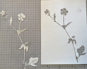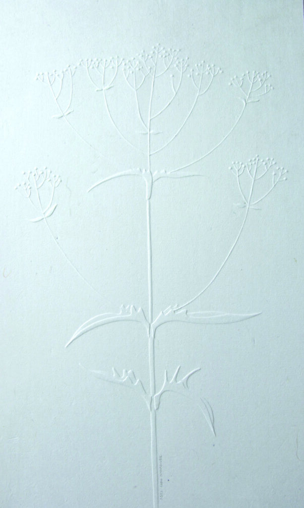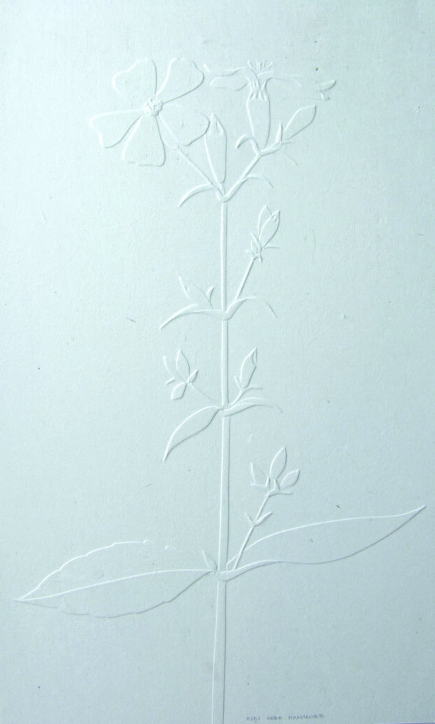 そう、八ヶ岳でスケッチした野の花を今回は。というか、八ヶ岳でずっとスケッチし続けていて、ハンドエンボスの作品たくさん制作しました。何故、野の花なのかというと、ハンドエンボスの技法というのが、エッチングの空押しや、紙版を重ねたプレス機を使うエンボス技法ではなくて、ライトテーブルを使い、紙版の上に本紙を置き(紙の裏側からの作業)、透過して見える版のエッジをスタイラスと言う道具で押して凹凸を付けます。紙版は細かくパーツに分けて、それを版の中に戻しながら新しくできたエッジを押していくことによって奥行き感が出せるところが特色です。やはりこの表現方法の、奥行きを出せるという特性を一番表現できるのが植物、それも八ヶ岳の植物だったっということかしらね。